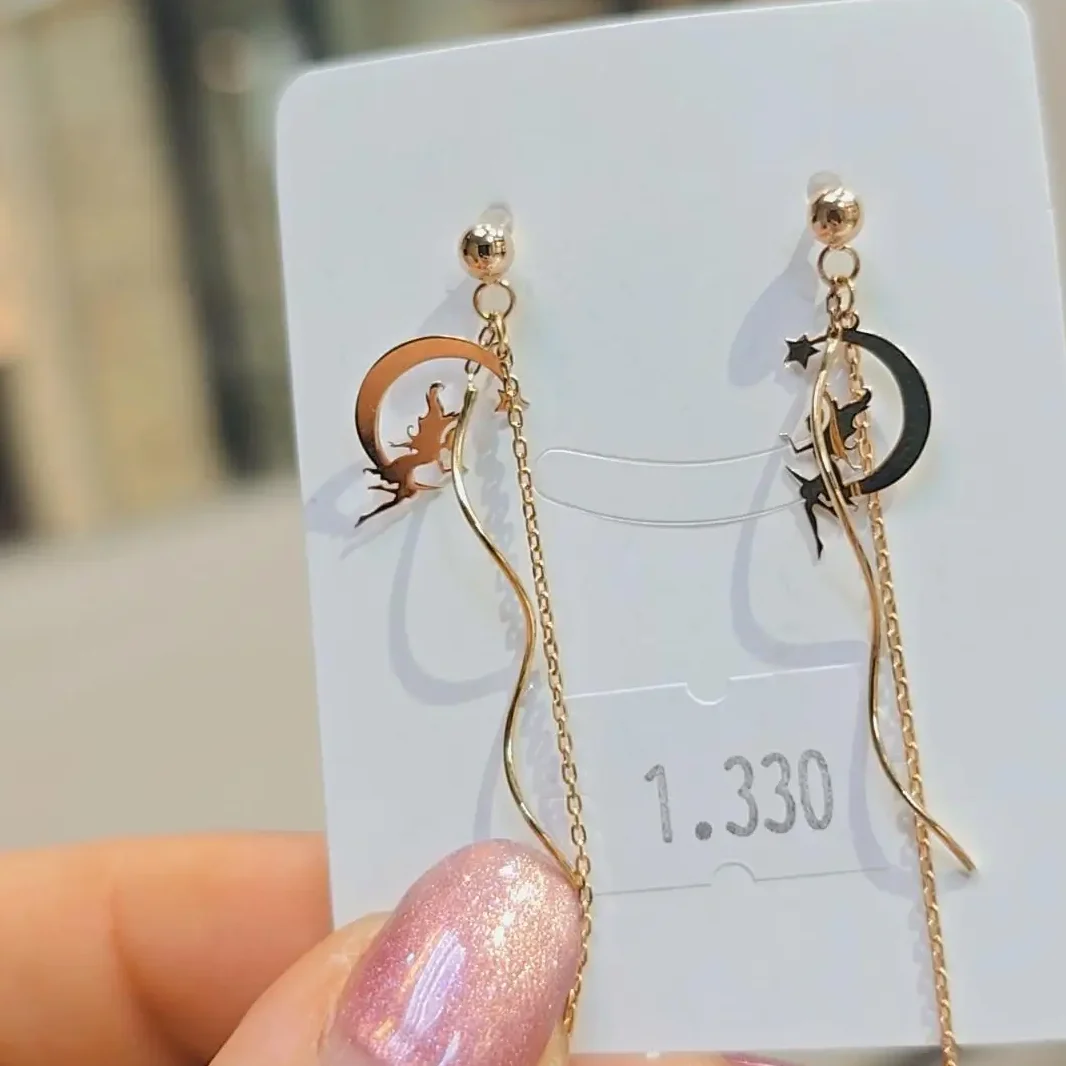 گوشواره کرلی میخی با سه اویز کرلی و زنجیر فلامینگو و پلاک لیزری فرشته