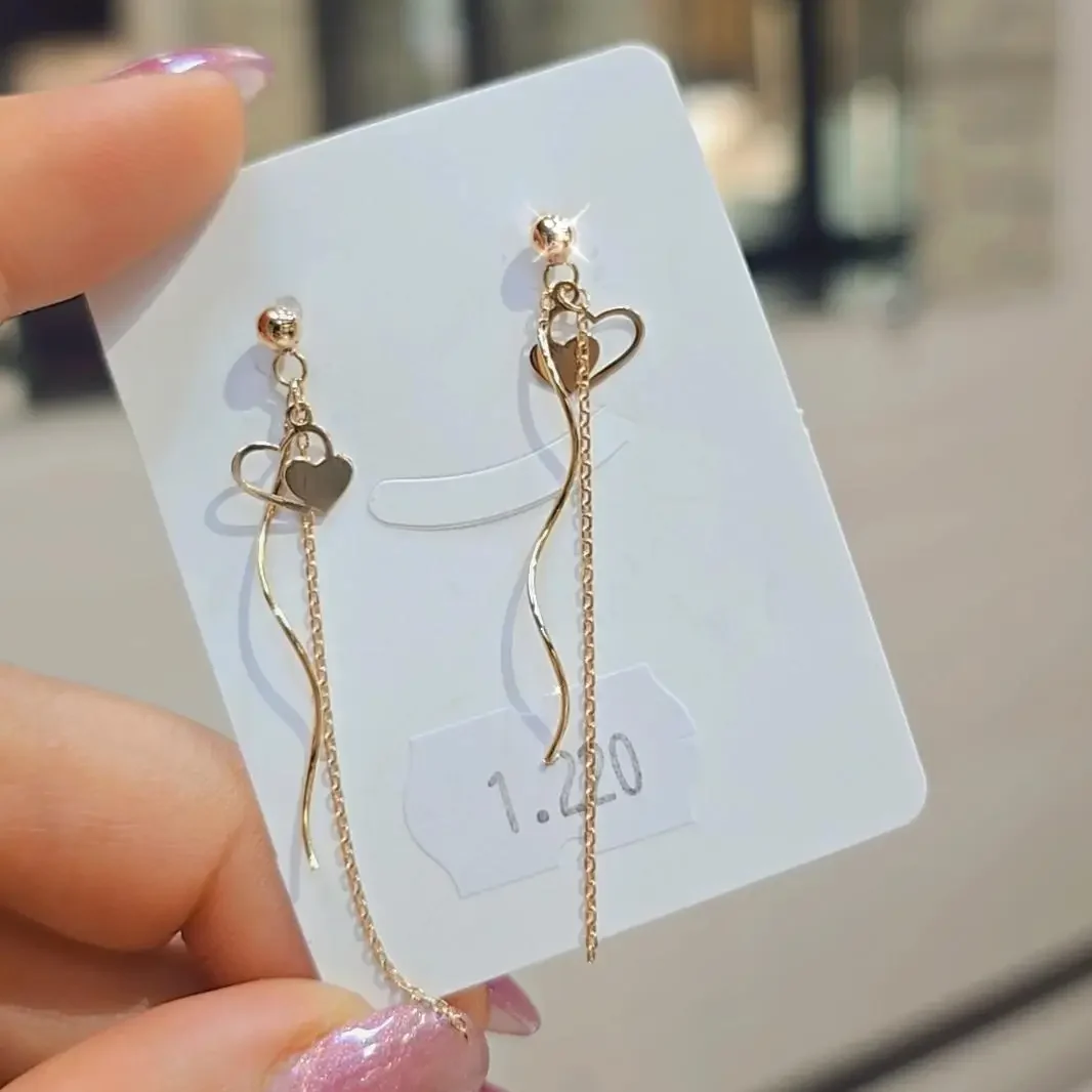 گوشواره کرلی میخی با سه اویز کرلی و زنجیر فلامینگو و پلاک لیزری قلب